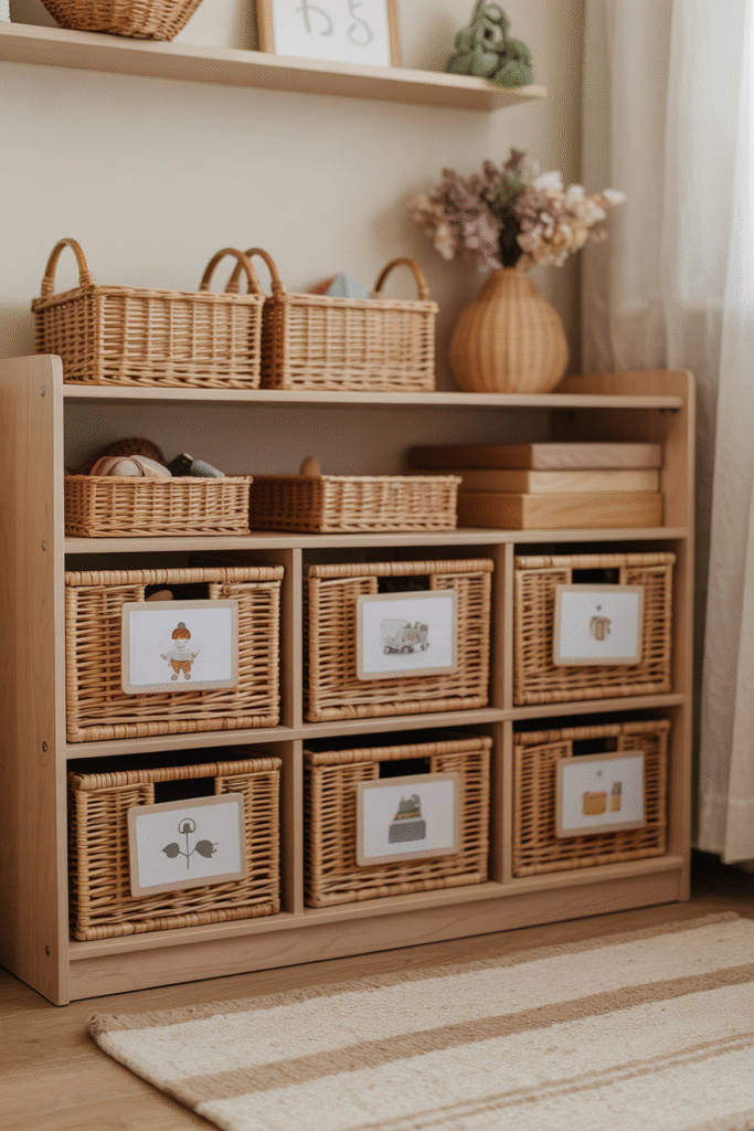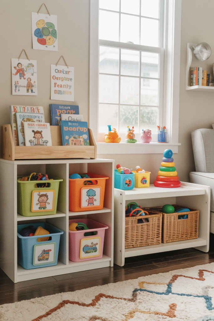 - Color-coded baskets: Blue for blocks, yellow for cars, green for art supplies.