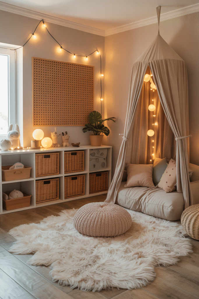 - Gentle lighting: String lights, warm lamps, or dimmable LEDs. Bright overhead lights often overstimulate kids.